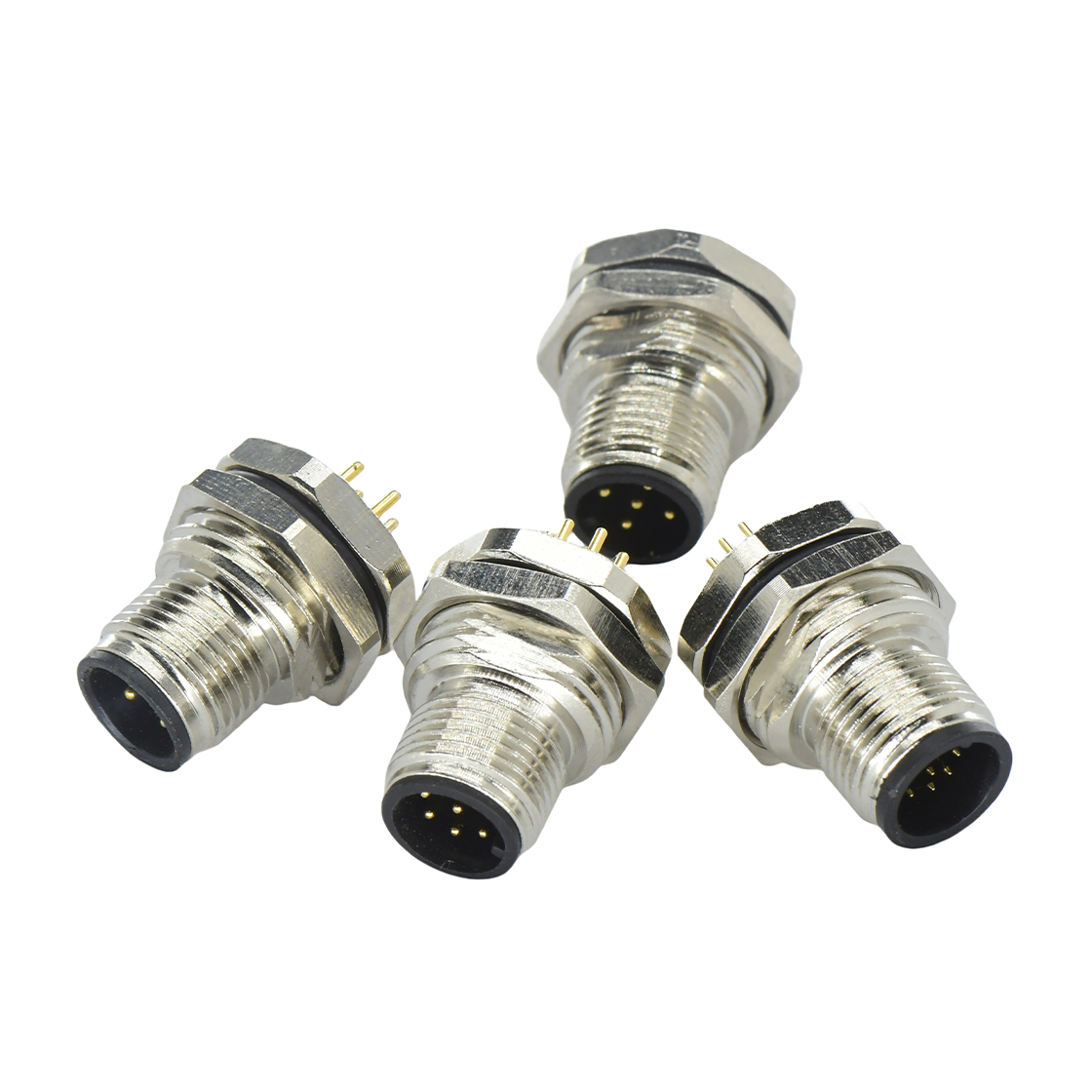 M12 front locking panel male straight connector, using PCB structure, aperture alignment M16 size, design standard IEC 61076-2-101, is one of the most commonly used connectors in the field of factory automation