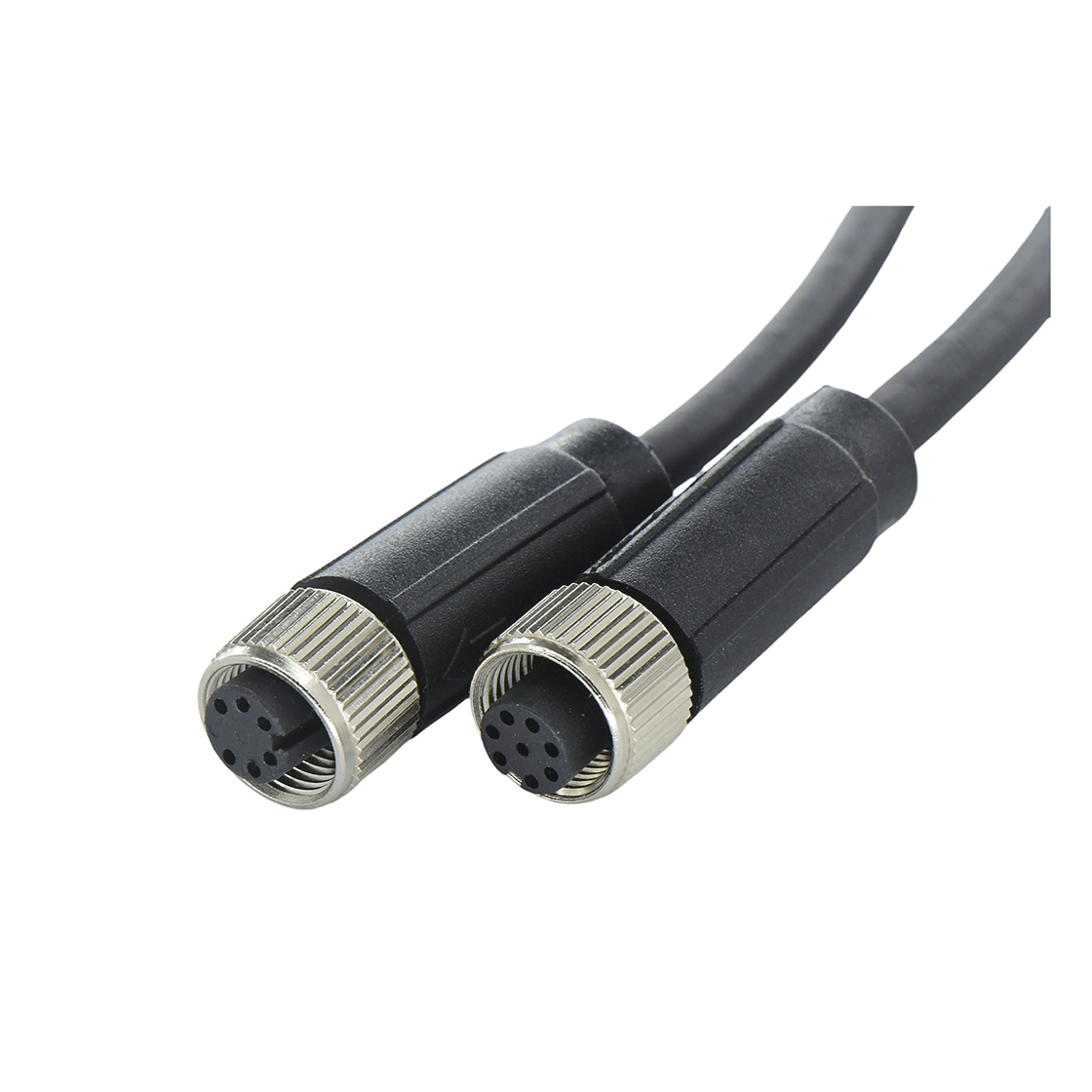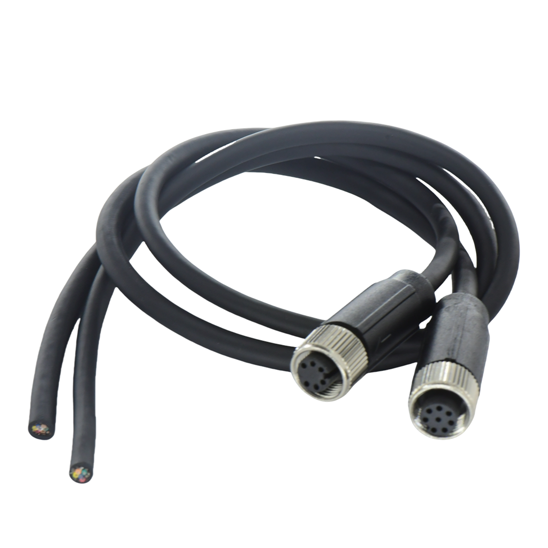 M12 Female Adult Wire Connector with soldered wire construction, mesh nut and customized shielding for use in extreme industrial environments.