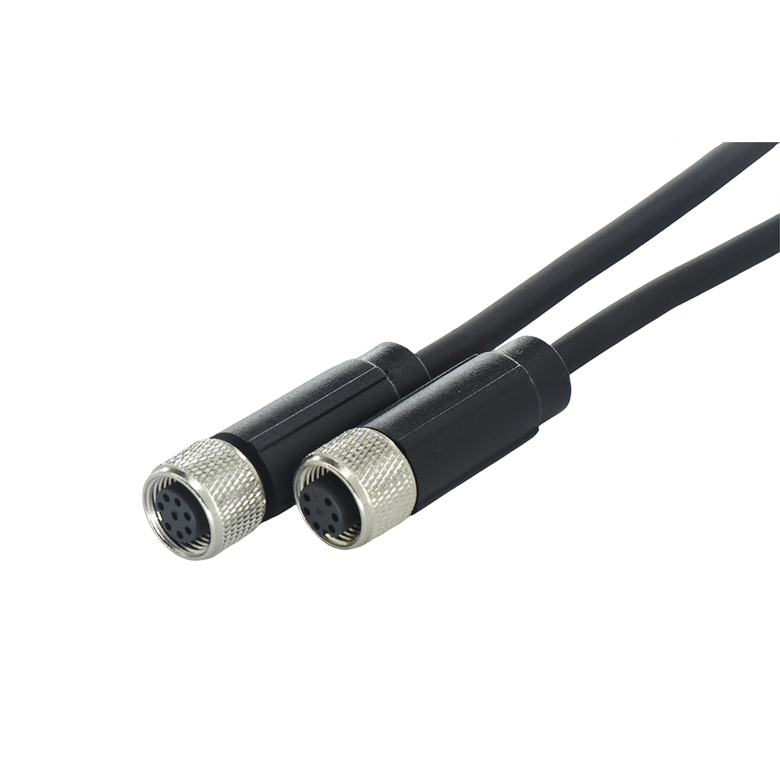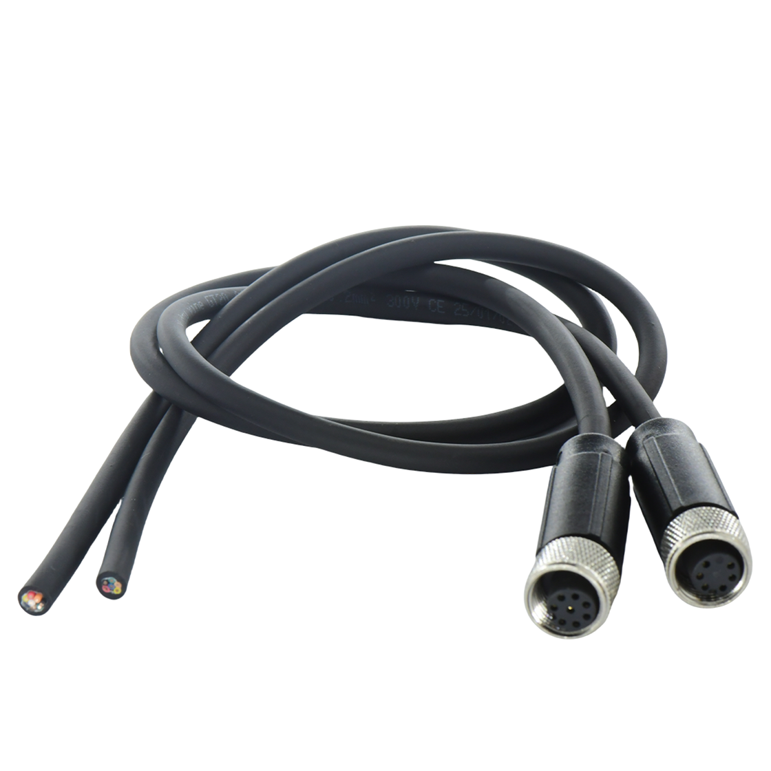 M12 Female Adult Wire Connector with solder wire construction, mesh nut and customized shielding for use in extreme industrial environments.